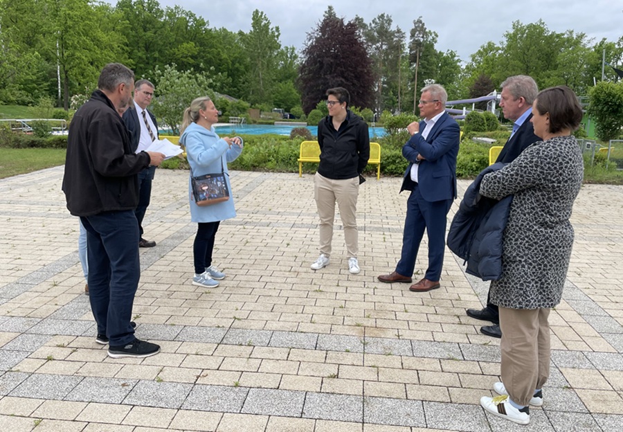 Eine Station bei der Fördertour: MdB Andreas Schwarz bei der Besichtigung des Stadionbades mit Vertreter*innen der Stadt und der Stadtwerke Bamberg. Nun erhält die Stadt für die Sanierung des Freibades 7,5 Mio. Euro vom Bund.